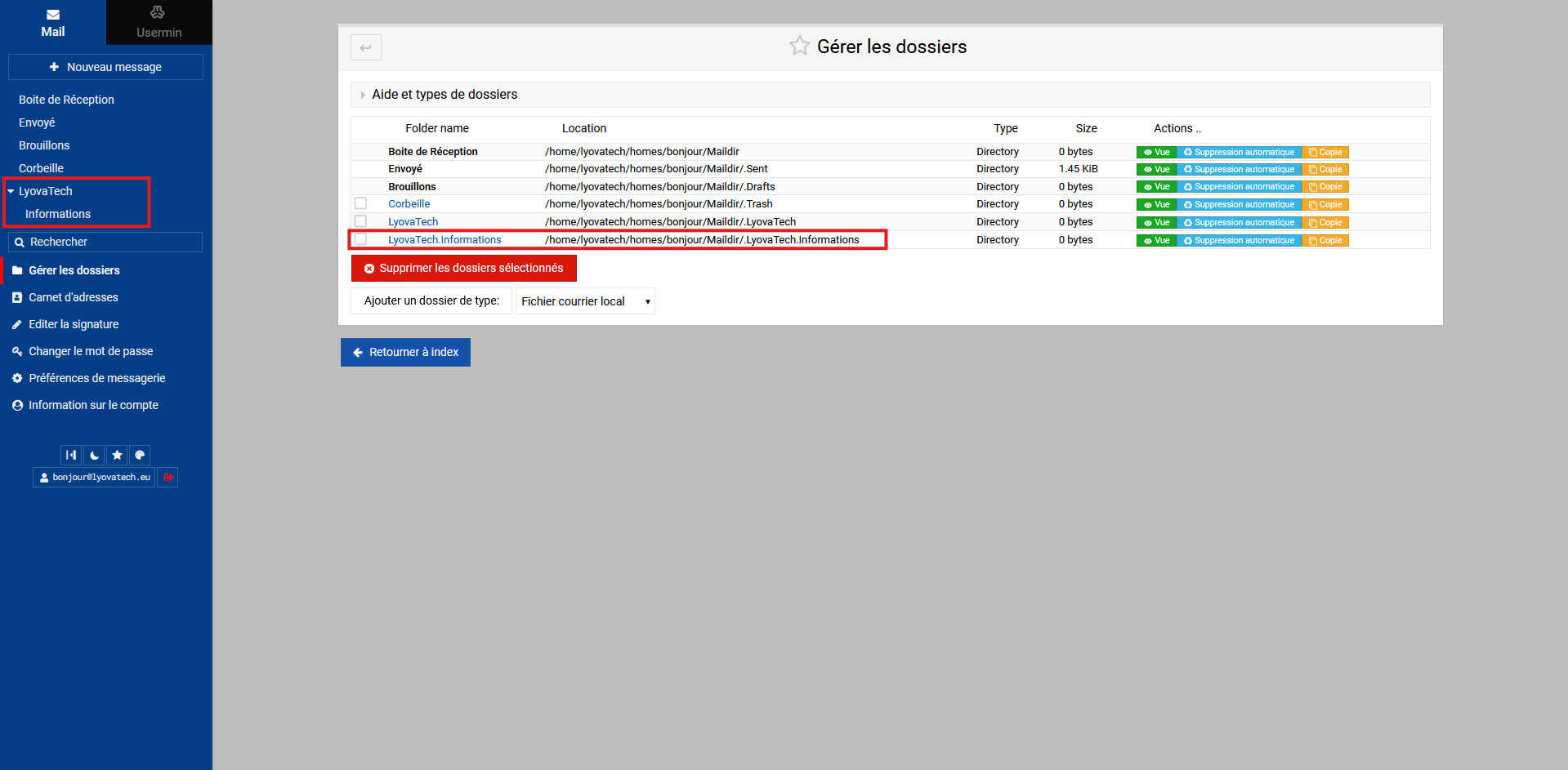 Si vous souhaitez ajouter un sous-dossier nommé "Informations" dans le dossier "LyovaTech", saisissez :