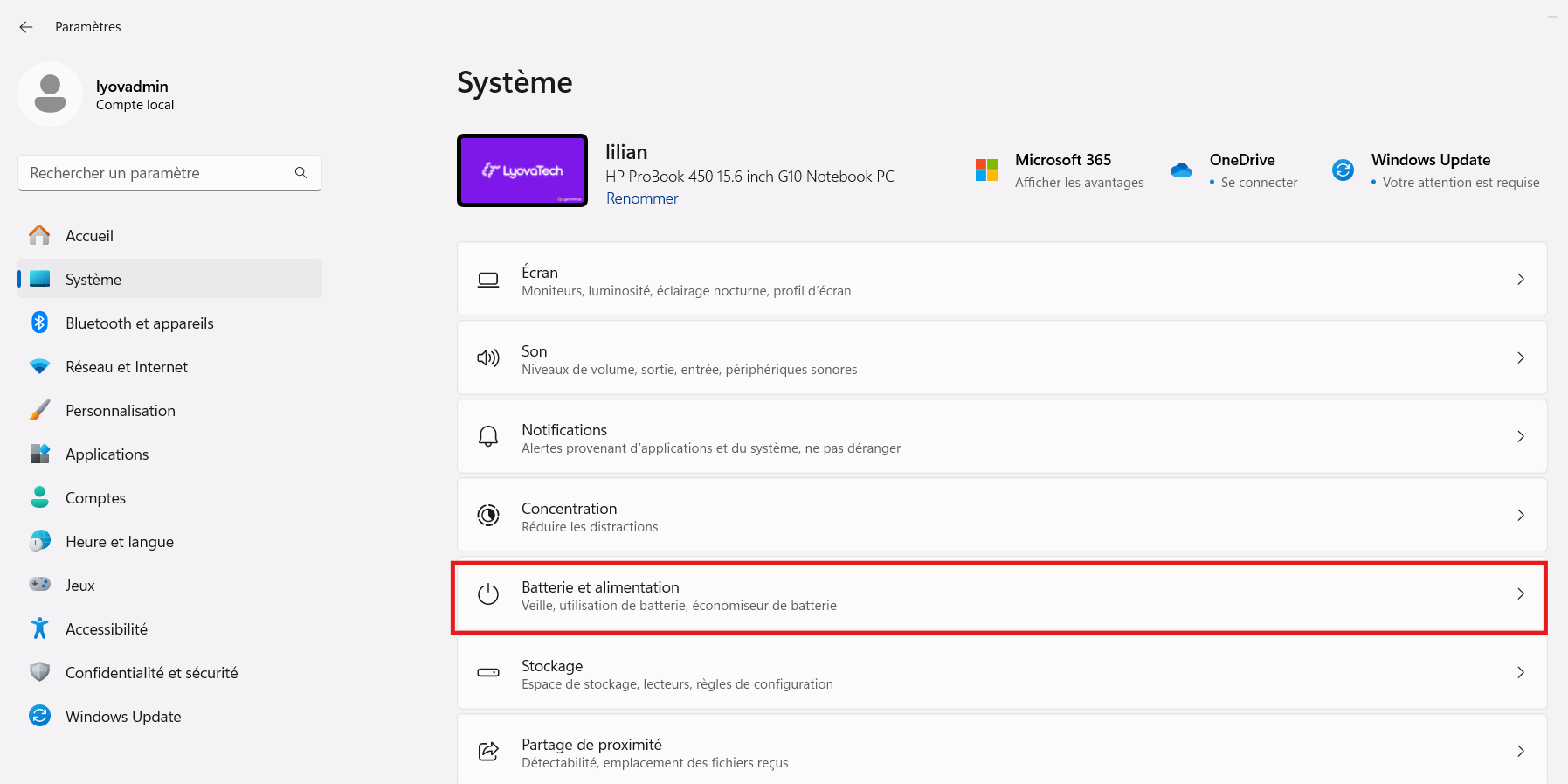 → Appuie surWindows + Iou clique sur le menu Démarrer > Paramètres.Va dans Système > Alimentation et batterie