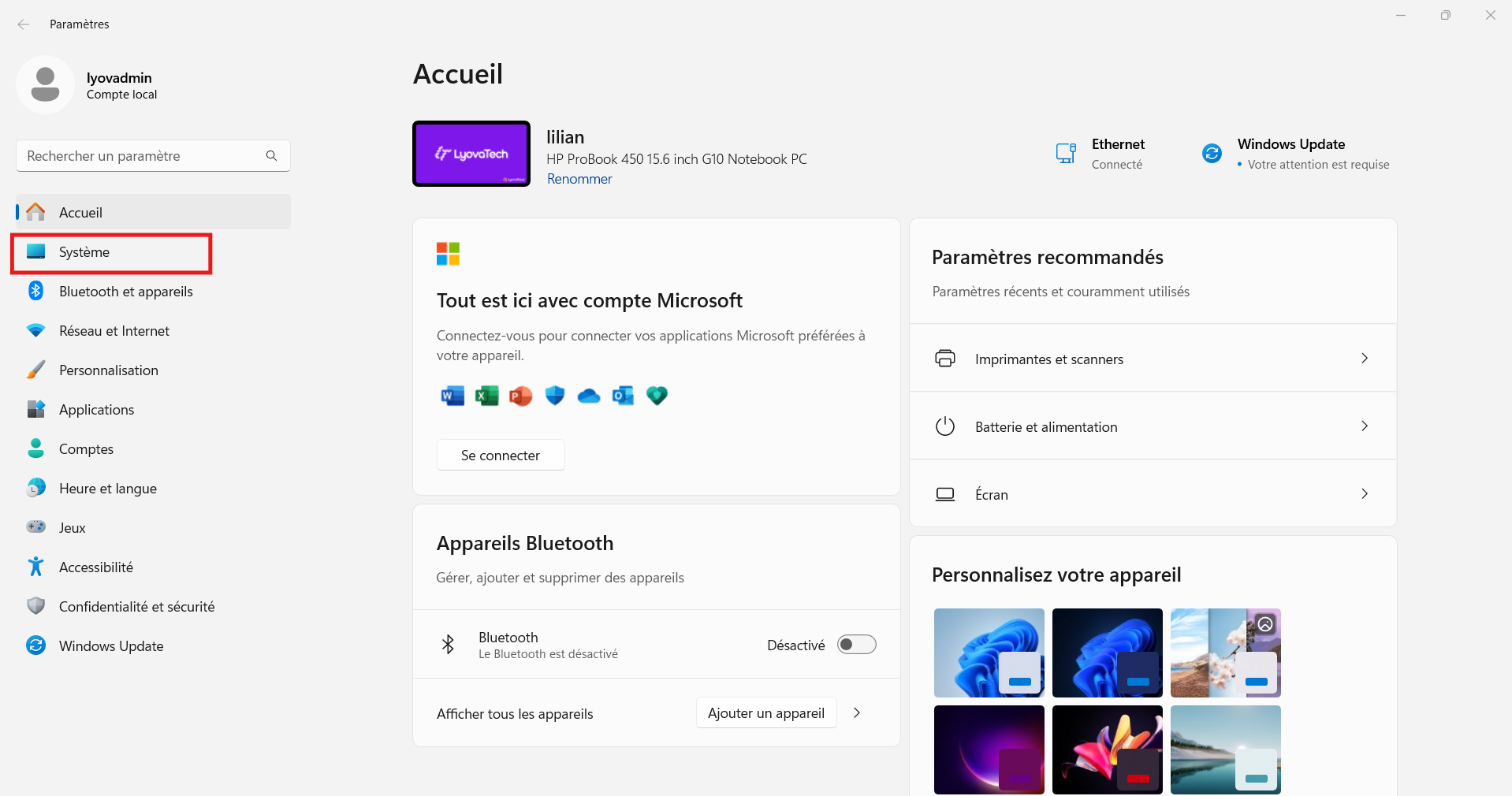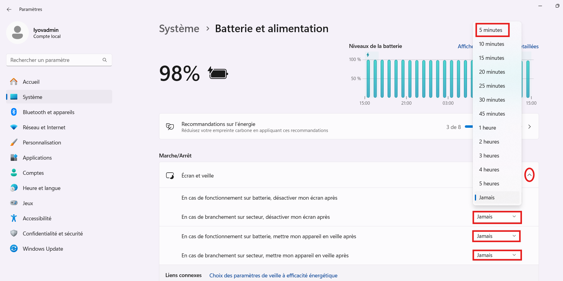 (ou Système > Alimentation et mise en veille sur certaines versions).Dans la section Écran et mise en veille :